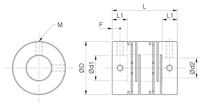 | 모델 | D | d1/d2 | L | L1 | F | M | 체결토크 | 상용토크 | 최대토크 | 최대회전속도 | 관성모멘트 | 비틀림강성 | 질량 | |